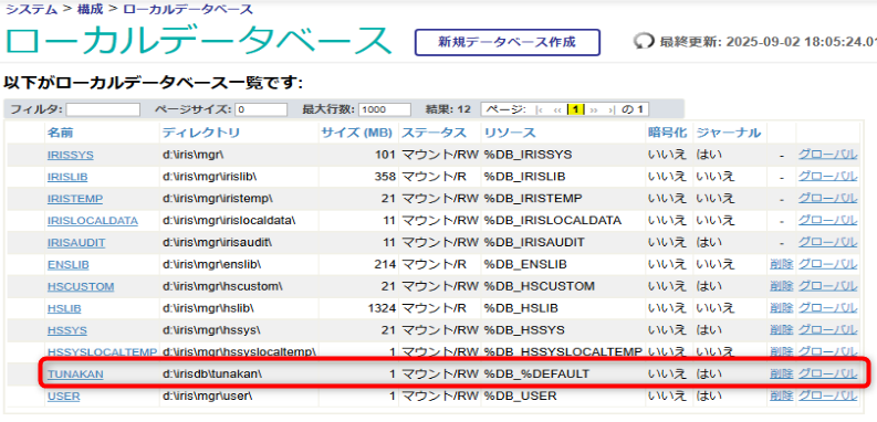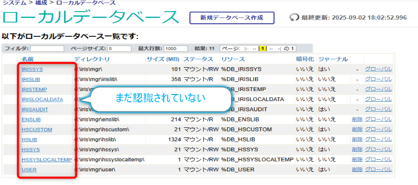この状態だと、まだ管理ポータルの[ローカルデータベース]画面では、作成したデータベースが認識されていません。