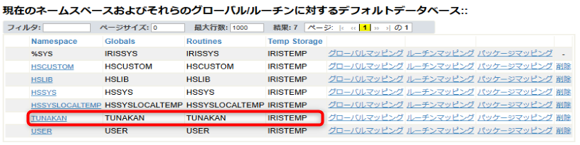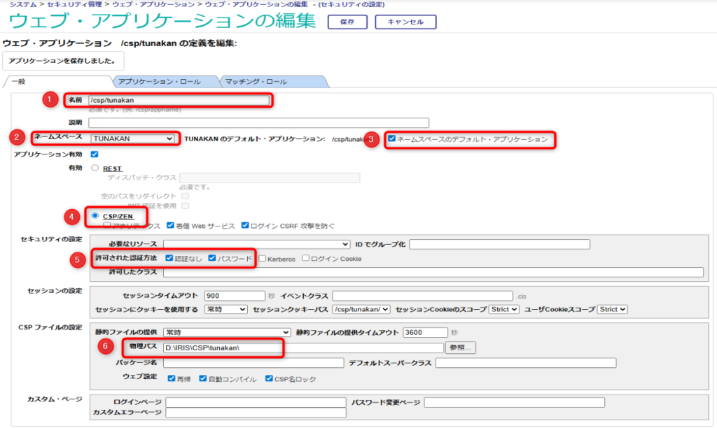 6 | 物理パス | 「インストールディレクトリ + \csp\ネームスペース名\」で設定しておきます。 例) s dir = “D:\IRIS\CSP\tunakan\” w ##class(%File).CreateDirectoryChain([dir]) |