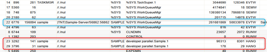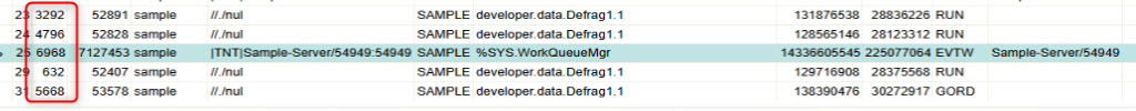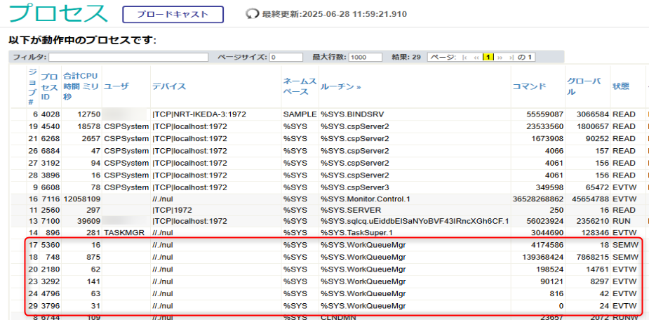 プロセス一覧の中で、ルーチン列の「%SYS.WOrkQueueMgr」を表記されているプロセスが、作業キュー・マネージャ関連のプロセスになります。