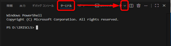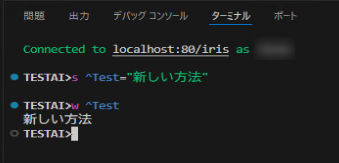 VS Codeの「ターミナル」にて、下記コマンドを入力すると、IRISターミナルに切り替わります。
